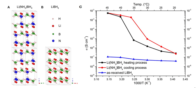 图1 A 氨化物晶体结构;B 硼氢化锂晶体结构;C 硼氢化锂和氨化物锂离子固态电导率。