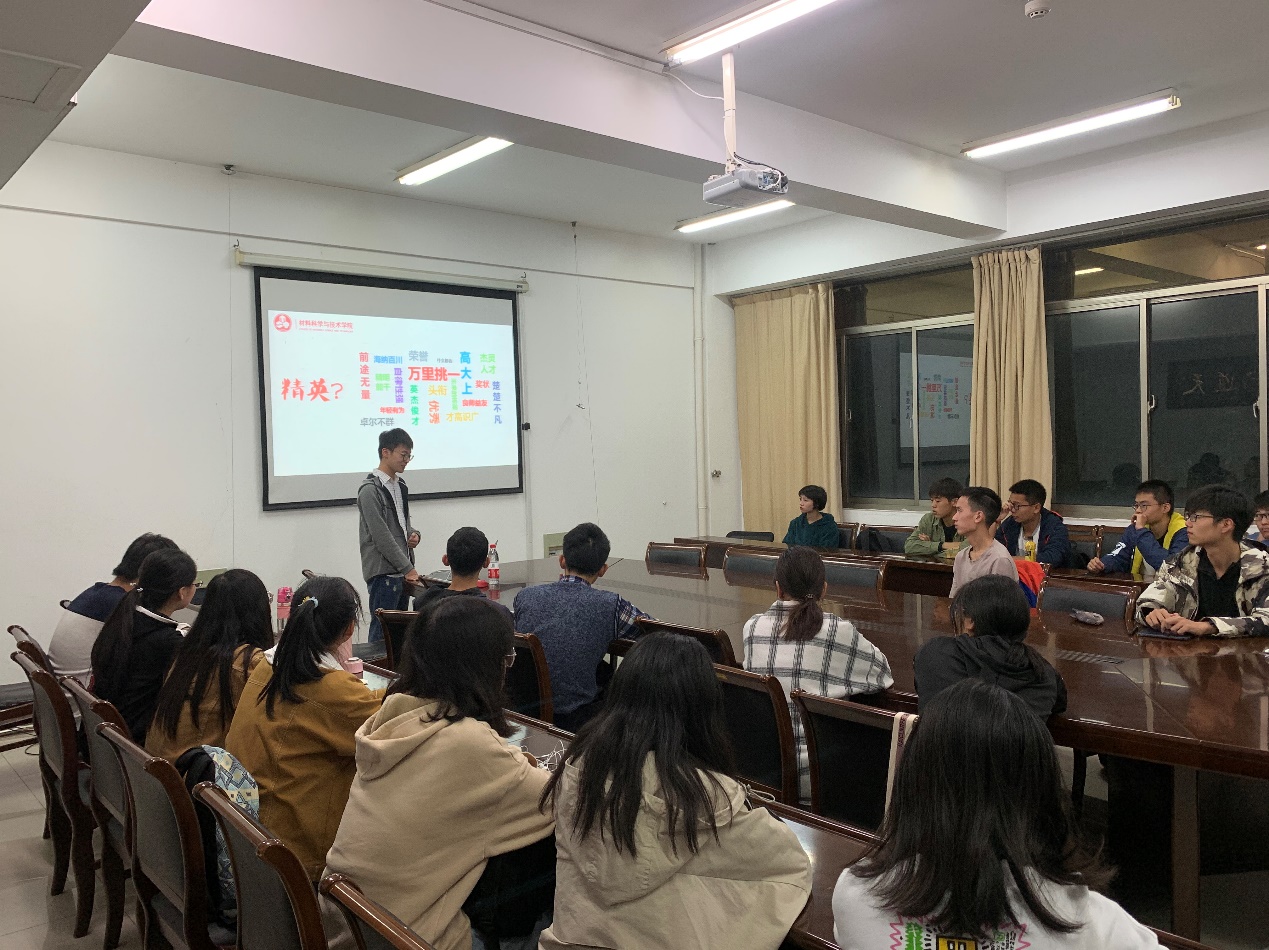 为进一步发挥本科生朋辈导师的“传、帮、带”作用,培养低年级本科生独立思考,科学规划的能力,11月16日晚,炸金花平台 第十四期“学长学姐说”交流会在材料楼259会议室成功举行。交流会上,炸金花平台 0616100班班长,2016-2017学年、2018-2019学年国家奖学金获得者宗旸与低年级本科生分享他的国家奖学金之路。