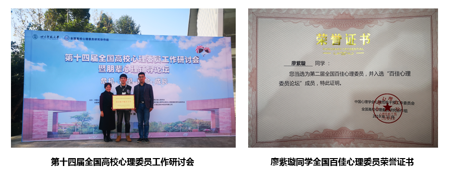 近日,第二届全国百佳心理委员论坛在四川师范大学举行,经面试和综合考虑,炸金花平台 心理中心推荐炸金花平台 廖紫璇同学与能源与动力炸金花平台 、民航/飞行炸金花平台 等的两位同学参加全国评优。最终,三位同学从190名参赛者中脱颖而出,成功进入前一百名,荣获“第二届全国百佳心理委员”荣誉称号。