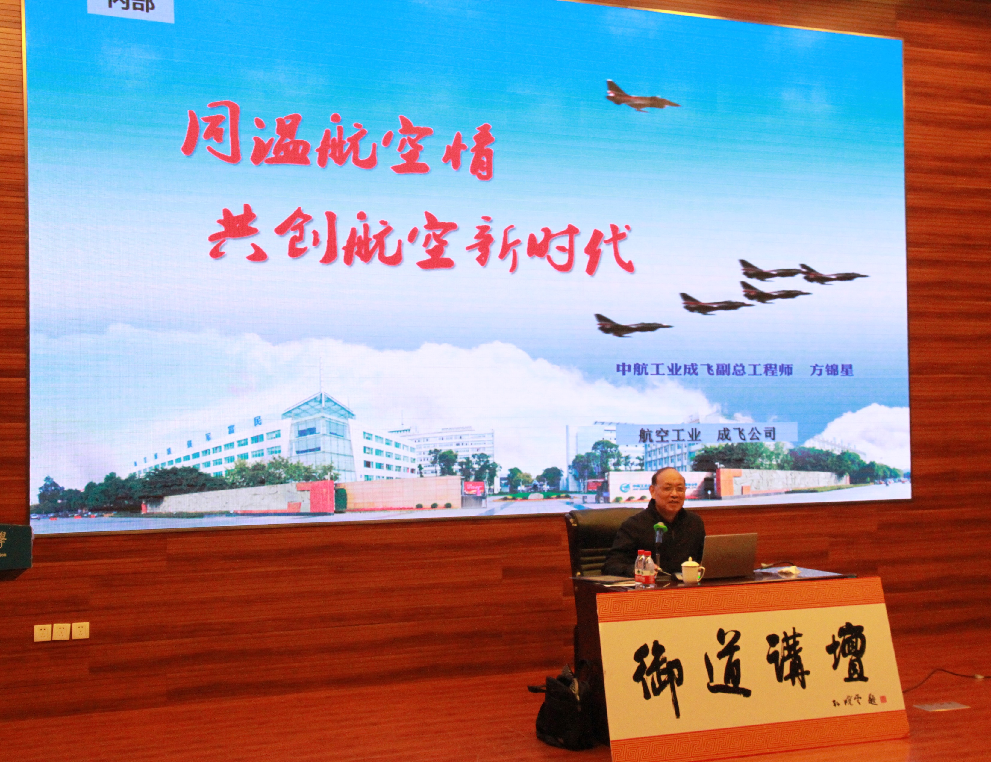 随后方锦星简要介绍了成飞的发展历程,并结合自身从事飞机研制工作近50年的工作阅历和经验,通过“航空发展动态”、“制造技术发展动态”、“航空先进制造技术”三个部分讲动情地述了飞机史、航空情、中国梦,激情澎湃的演讲赢得了现场师生的阵阵掌声。同时他还号召在座的同学要珍惜韶华、勤于学习,大力弘扬航空报国精神,自觉肩负航空强国使命。