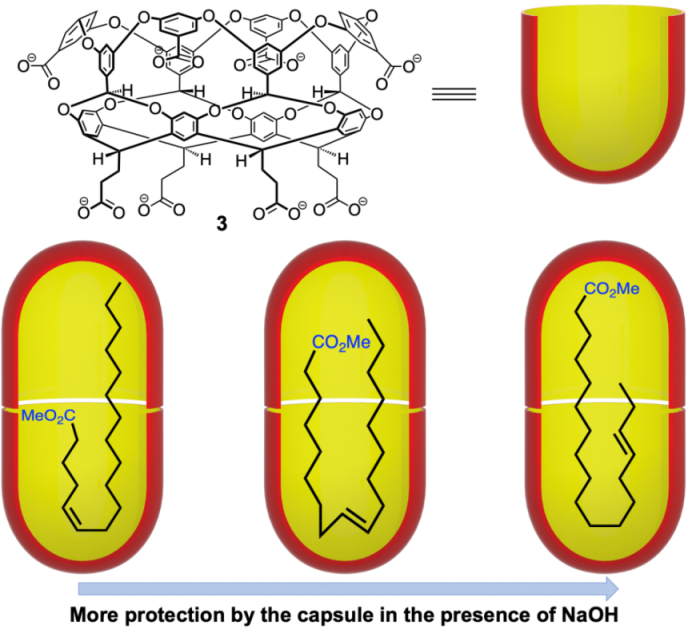 图2. Gibb等通过疏水作用自组装形成超分子纳米胶囊用于顺式和反式单不饱和脂肪酸酯的选择性保护,弯曲的构象使得在胶囊内部的酯基受到不同程度的保护。(J. Org. Chem.2017, 82, 4279-4288;Chem. Comm.2019, 55, 11695-11698.)