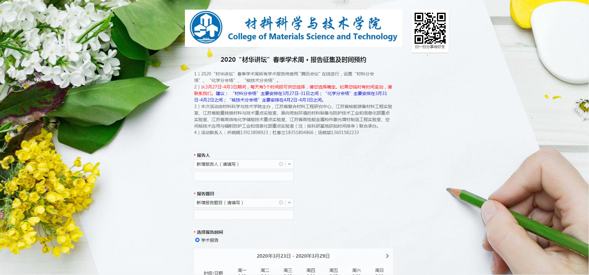 2020年3月27日—4月3日,炸金花平台 通过网络在线方式举办了2020“材华讲坛”春季学术报告周活动。由于新冠肺炎疫情影响,炸金花平台 至今仍无法开学,广大学生也无法到校正常学习。炸金花平台 贯彻落实“停课不停学”的炸金花平台 要求,决定在此期间采用网络会议形式举办2020“材华讲坛”春季学术报告周活动,以期达到宣传炸金花平台 炸金花平台 、加强学术科研交流、推动本科生专业培养、开展研究生招生宣传等目的。