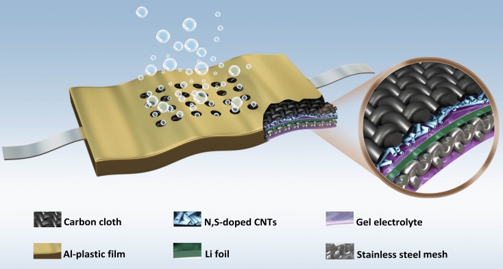 该团队以双掺杂的碳纳米管为高活性的正极催化剂,以PVDF−HFP基聚合物凝胶为电解质,设计出准固态的薄片状柔性Li−CO2电池。该准固态电池的性能非常突出,其比容量达到23560 mAh g−1,循环寿命达到538圈,能连续运行110天以上。由于电解质与电极结构的柔韧性,该准固态电池能作为可穿戴的柔性器件使用。通过对反应产物Li2CO3形态的研究和对交流阻抗结果的分析,可以发现凝胶电解质的存在能降低充放电过程的极化。在凝胶电解质中,Li+的传输路径被分散,并且分布在相互独立的聚合物孔道内,从而使放电时正极上会产生相互独立的小颗粒状的Li2CO3,其结晶度低,容易形成和分解,因此能使准固态电池的充放电性能明显高于液态电解质的电池。