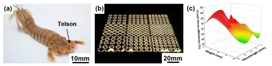 图4 激光增材制造轻量化抗冲击仿生功能结构:(a)皮皮虾尾节宏观形貌;(b)仿生双向波纹板抗冲击结构SLM加工;(c)仿生双向波纹板结构高度和波长参数对冲击力效率的影响