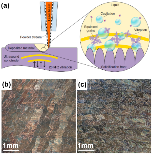 图3 超声复合激光增材制造TC4合金显微组织调控:(a)激光熔化沉积复合高频超声振动工艺;(b)常规激光熔化沉积TC4合金的粗大柱状晶;(c)超声复合激光增材制造TC4合金的细小等轴晶