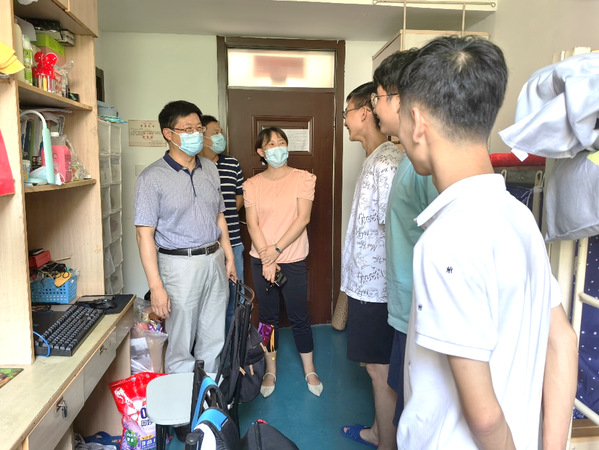 截至8月16日晚,炸金花平台 本科年级返校人数已达663人。为了深入了解返校同学们的生活状况,切实解决同学们所遇到的实际问题,加强疫情防控期间学生的安全稳定管理,8月16日下午,院长张校刚、党委副书记许赞、副院长陶海军以及各年级辅导员一同走进学生宿舍,慰问时隔半年又重新返校的同学们。