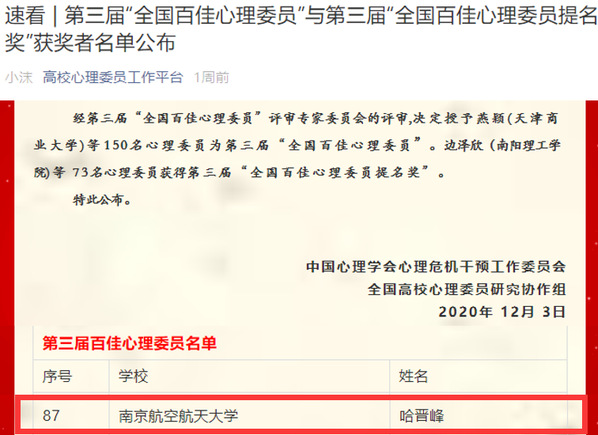 2020年是全国高校心理委员工作研讨会暨朋辈心理辅导论坛举办的第十五年。11月23日上午,第十五届全国高校心理委员工作研讨会暨朋辈心理辅导论坛以线上直播的形式正式拉开帷幕。经过全校综合选拔,示推荐了炸金花平台 的哈晋峰、炸金花平台 的罗岚、民航/飞行炸金花平台 的张晨阳、同学参与全国百佳心理委员的评选。最终,哈晋峰从全国248名参赛者中脱颖而出,荣获“第三届全国百佳心理委员”称号,罗岚,张晨阳同学荣获“第三届全国百佳心理委员提名奖”。