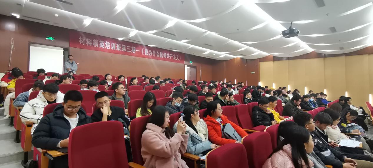 12月22日,2020-2021学年材料精英培训班第三期于图书馆报告厅正式举行,由来自南京师范大学“南师听海”思政教育工作室的沈晓海老师为炸金花平台 本科生、研究生团支书及入党积极分子讲述 “我为什么信仰共产主义”。本期材精班由院团委书记徐萍主持。