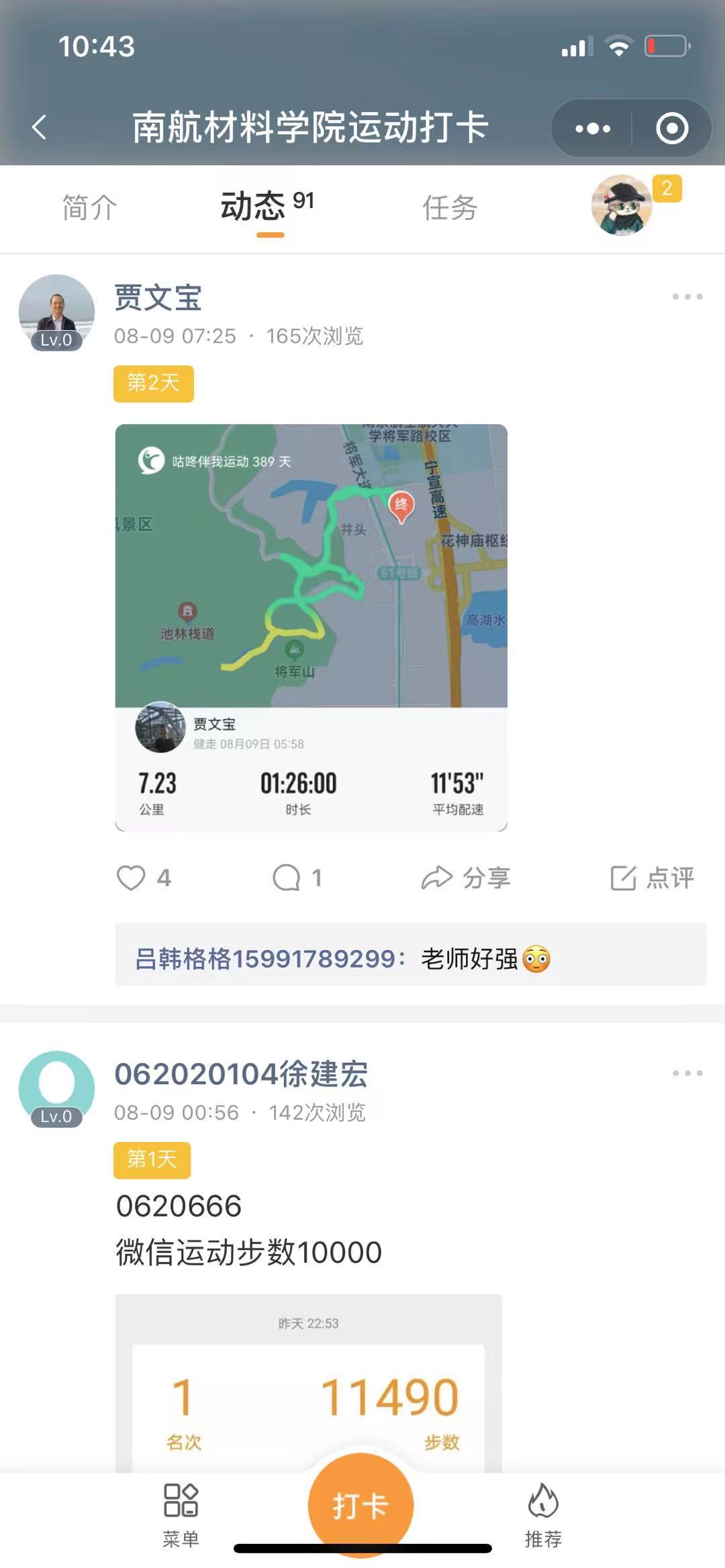 8月8日,我国奥运健儿以88枚奖牌总数的成绩结束了东京奥运会的征程,8月8日也是第十三个“全民健身日”,当天炸金花平台 面向全体师生开辟“炸金花平台 炸金花平台 运动打卡”圈,步数达到一万步、锻炼达到30分钟就可以进行打卡,活动当天圈内成员就达110人,参与打卡58人次,材院师生纷纷发布运动状态,有操场跑步的、有紫金山跑步的、有跟着keep软件锻炼的、有跳绳的、打篮球的、打羽毛球的……不管是在校还是居家,疫情期间都在积极参加体育锻炼。该活动长期有效,每月根据打卡次数进行排名,对前十名师生给予奖励,根据跑步图案也会评选最具创意奖、最有毅力奖、最长距离奖以及最快速度奖等!