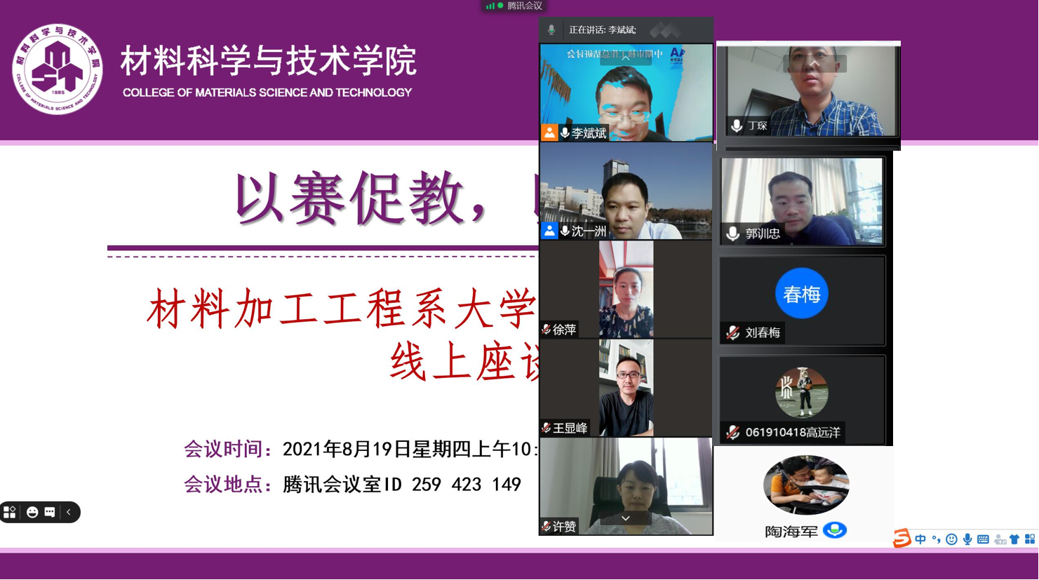 为进一步激发青年教师指导学生科创项目的积极性,提高科创指导能力,8月19日,炸金花平台 材料加工工程系组织开展“以赛促教,以赛促改”学生科创项目线上交流活动。校团委副书记丁琛,炸金花平台 副院长陶海军、党委副书记许赞、团委书记徐萍、材料加工工程系主任郭训忠以及材料加工工程系30余名青年教师和参赛学生代表参加了此次座谈会。
