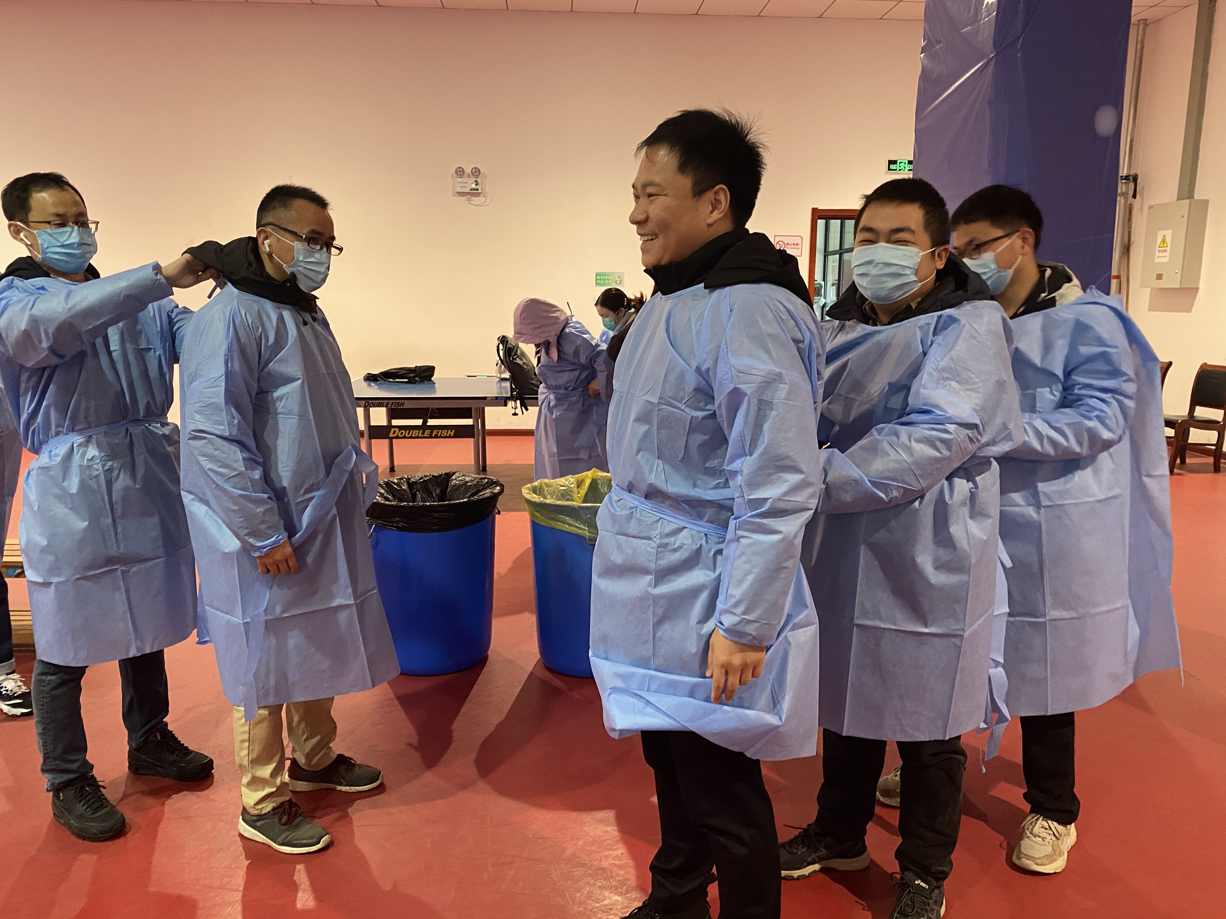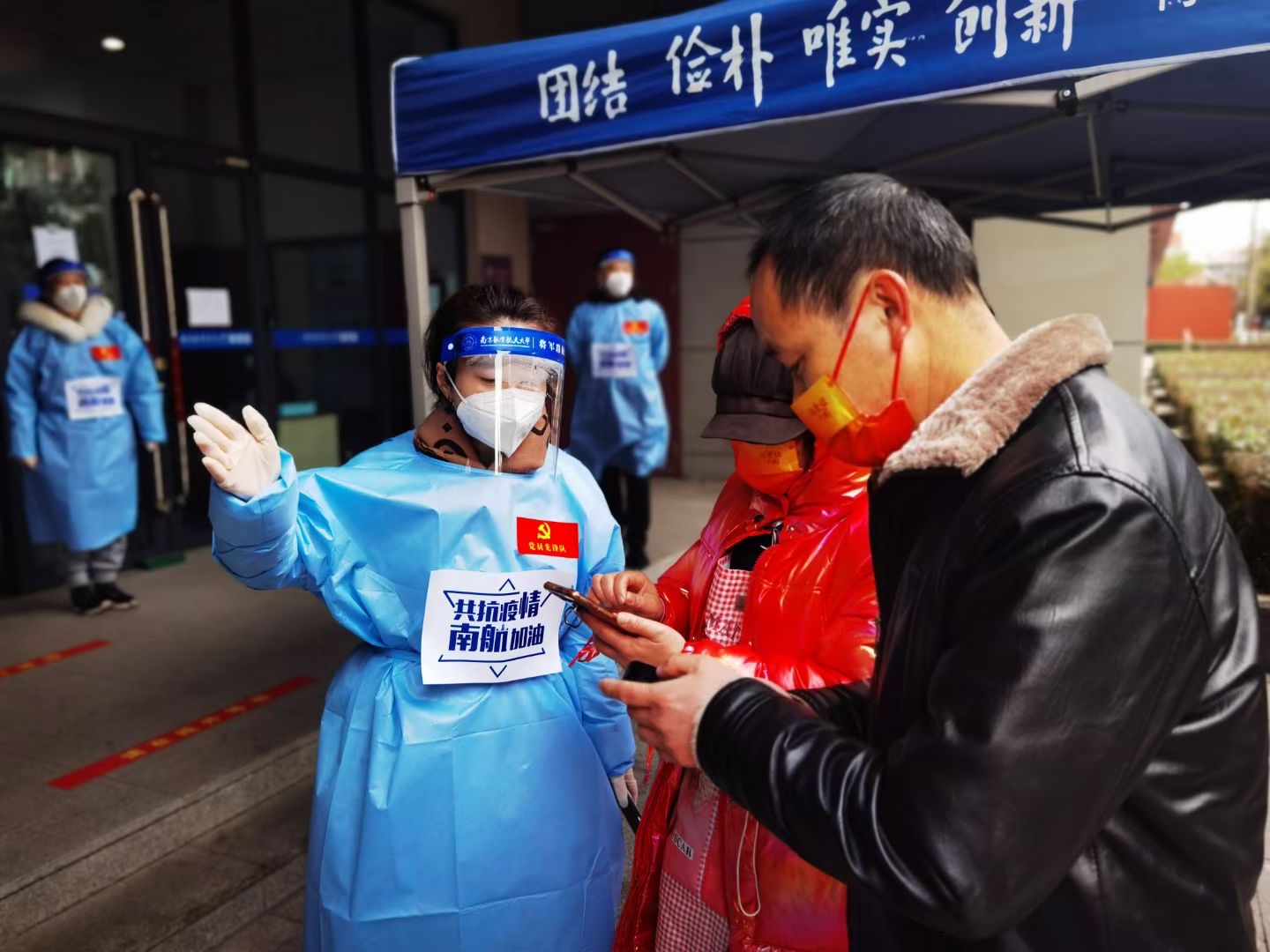 2月18日上午,参加志愿服务的老师们提前抵达体育馆和校门口,在校区管委会工作人员的指导下,穿戴好防护服,各就各位,或是维持秩序,或是引导队伍,或是信息录入,或是物质保障,说的最多的就是“带好口罩,做好个人防护”,“请提前准备好采样码”,做得最多的就是指导帮助一些没有操作过的后勤人员登记信息。蓝色的防护服穿在厚厚的棉服外,志愿者老师们像一只可爱的冰墩墩,亲切地提醒,可爱的模样,让风尘仆仆返校的师生们缓解劳累和压力,寒风中感受家的温暖。志愿者老师们用满腔热忱为返校学生安全有序核酸检测保驾护航,用实际行动诠释新时期的“四有”好教师的仁爱之心和责任担当。