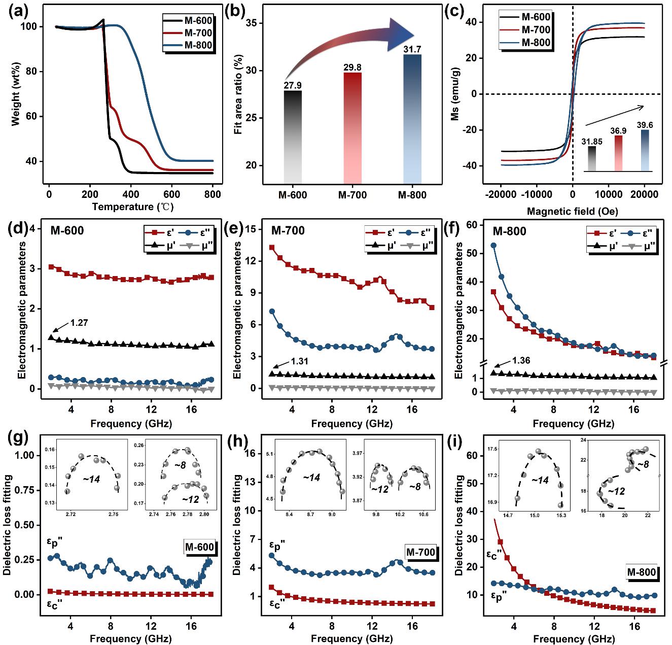 700 °C退火的样品(记为M-700)在25 wt%粉末填充量和小于2 mm的厚度下,表现6.6 GHz的有效吸收频宽和-62.5 dB的反射损耗值,明显优于600 °C和800 °C的样品。与同类吸波剂相比较,在轻、薄、宽、强等方面均有优势,而且角度平稳的低RCS仿真结果表明M-700作为涂层时,能够为军事武器在开放、复杂电磁环境中持续作业提供良好的防护作用。此外,电磁参数以及介电损耗拟合结果表明极化损耗是微波吸收的主导机制。