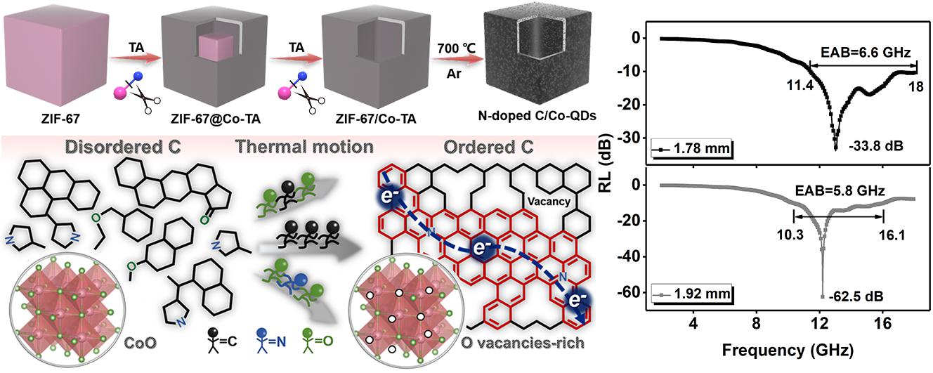 千兆赫兹(GHz)电磁应用在5G时代蓬勃发展,但电磁辐射等负产物会降低电子设备服务质量并威胁公众健康。于是,微波吸收(MA)材料,尤其是高度可调的金属有机框架(MOFs),被用来过滤废能。然而,简单的原位热解往往导致微观结构(如孔隙坍缩和金属团聚等)和化学性质(如原子序度和缺陷构型等)的不可控突变,这给深度理解电磁响应和针对性优化性能带来障碍。因此,明确而深刻地揭示强分子热运动后的原子重排、异质界面、原位掺杂、缺陷构型等微观尺度改变以及相应的微波损耗机制,对指导高性能吸波材料的设计至关重要。在这里,合作团队利用质子剪裁策略在ZIF-67中构造可控方腔,随后通过在惰性气氛下的梯度退火,制备出嵌有Co量子点的N掺杂C纳米盒(N-doped C/Co-QDs)粉体。研究表明,中空的几何结构以及和重构的碳原子网络增强了电荷转移能力,有助于焦耳散热。而氧空位引起的缺陷诱导极化主导了极化损耗强度,是该体系的核心损耗机制。此外,由于全方位协调的阻抗匹配和电磁衰减,掺有粉体的吸波涂层具有在开放电磁环境中应用的潜力。总之,这项工作不仅为选择性编码介电基因提供了一种简便而有效的策略,而且也为基因序列的权衡提供了新的见解。