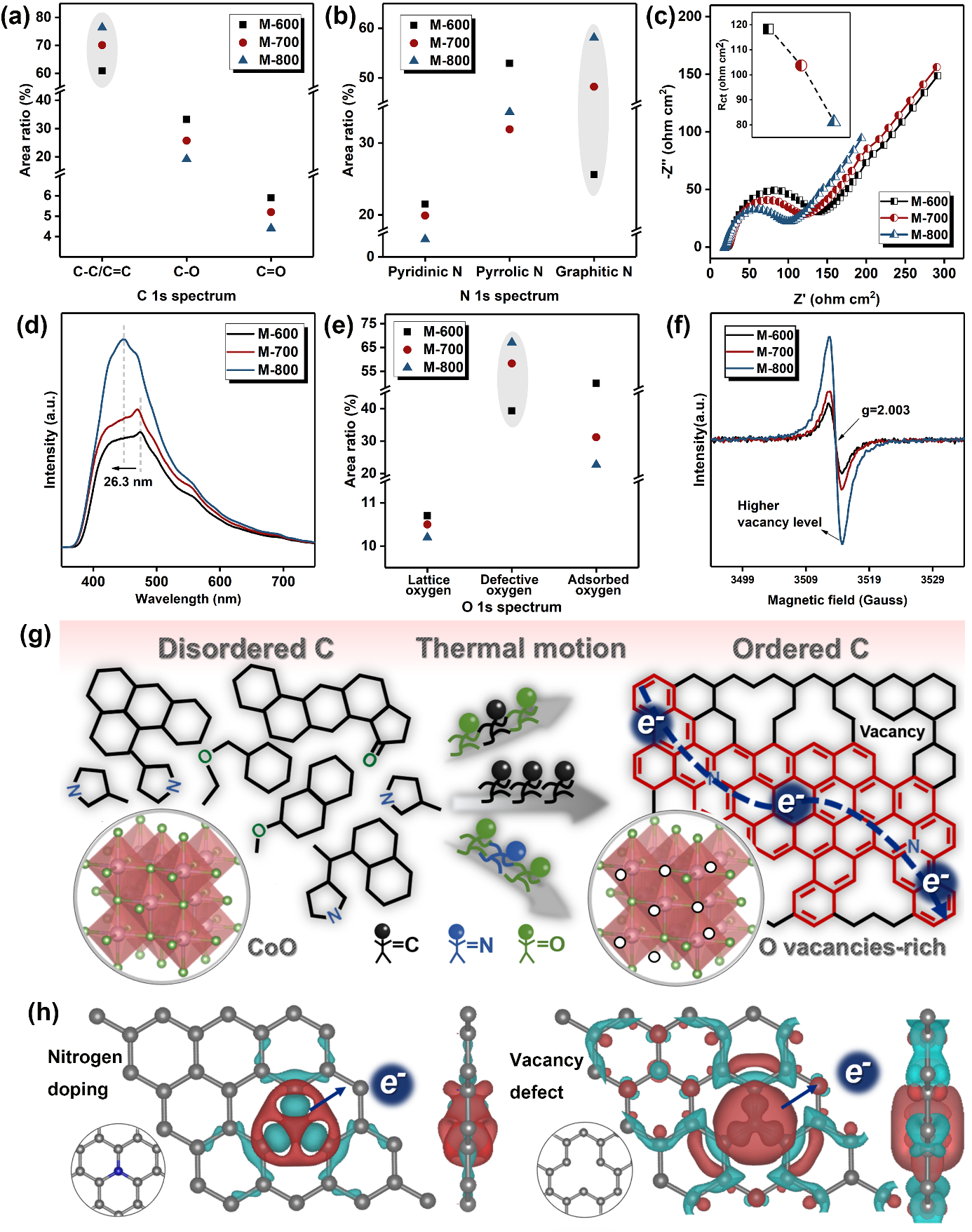 微观层面上,优化的原子有序性以及增加的石墨氮掺杂提高电子亲和力,与中空结构一起增强电荷转移特性,有助于电磁能转为焦耳热耗散。与此同时,减少的O、N极性基团,和增加的氧空位浓度共同说明原子重排过程中缺陷构型的转变(从杂原子到空位缺陷)。尽管杂原子和空位都能导致电子重新分布,但将缺陷种类和上述极化贡献关联后不难发现,是氧空位引起的介电极化主导了驰豫强度并导致电磁能被吸收。总之,在有序模型中构造特定无序单元,是吸波研究的重大发现。