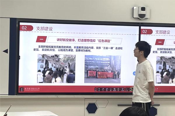 郑荣伟从“讲好航空故事”、“用活航空知识”以及“弘扬航空精神”三个方面展示了样板支部建设情况。支部依托全国唯一的直升机专业,传承红色基因,弘扬“航空报国”精神,坚持以行业文化和国防文化涵养学生,凝聚、带动研究生服务国家重大战略需求,深化实践育人,支部成员在创新创业、航空科普、美丽中国建设中展现出了青年担当。