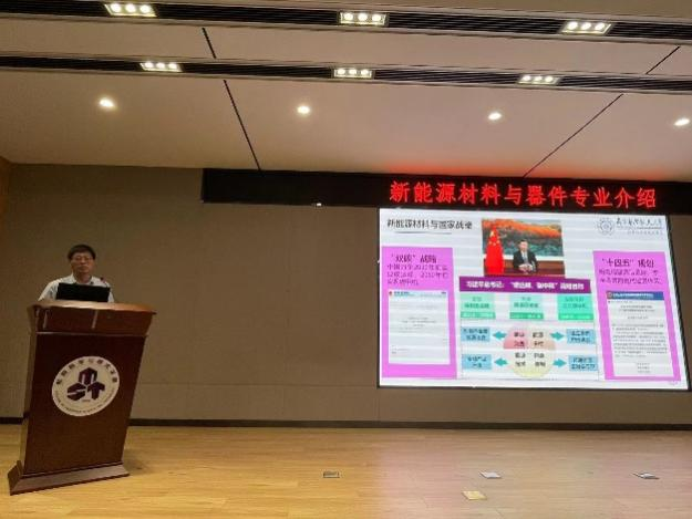 首先,2019级优秀毕业生代表雷志浩同学分享了他自己的求学经历,鼓励同学们要勇于尝试不要畏惧失败,品味在学习过程中获得的乐趣与经历,不断攀登,始终坚定自己的目标朝前看。雷志浩同学亲切的言语与体会引发同学们的共鸣,同时更为有效地让同学们了解专业概况,学习“过来人”的经验,明确自身定位。随后,专业负责人张校刚教授向同学们介绍了专业详情,从专业发展史、师资力量、建设发展,讲到国家计划、专业定位、专业培养以及专业发展方向、就业前景与典型案例。张校刚深入浅出的演讲使得同学们对“新能源材料与器件”专业,有了更深刻的理解与认知。