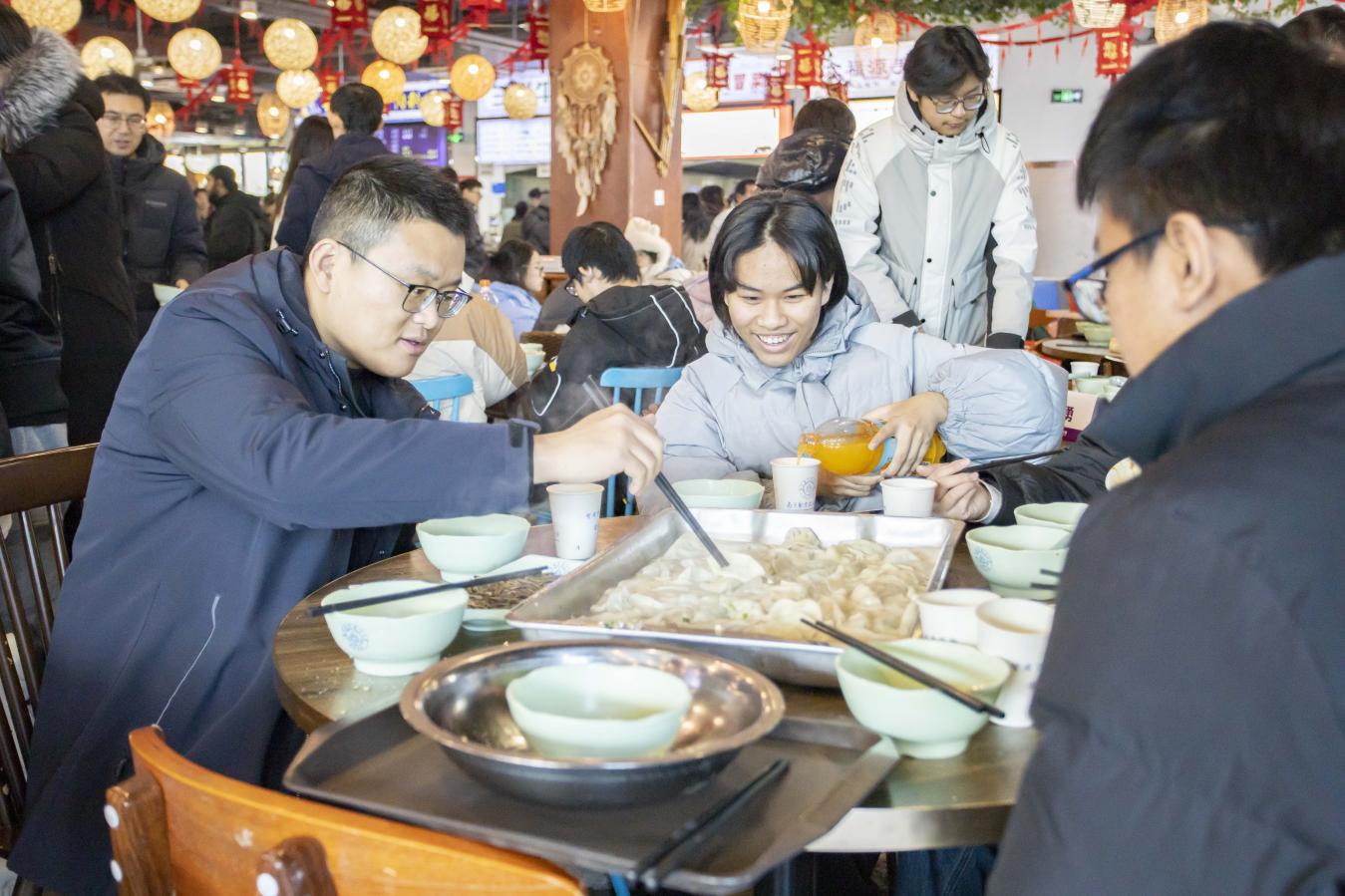 院领导、班主任和同学们边学包边交流,在欢乐的气氛中询问同学们的日常生活,关心近期的期末复习,叮嘱天寒多加衣……不一会儿,白白胖胖的饺子就包好了,大家包的饺子,有的造型独特,有的圆润饱满,这是全体师生共同努力、团结协作的劳动成果,也是师生欢聚一堂的见证。