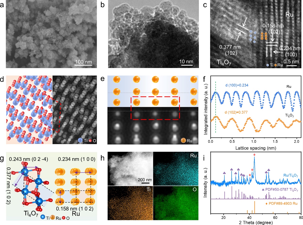 研究团队通过湿化学方法将Ru纳米颗粒(NP)沉积在具有不同化学计量比(TiO、Ti4O7和TiO2)的氧化钛载体上,Ti4O7可以与Ru NPs实现合适的界面晶格接触,这为自适应金属-载体相互作用和快速界面电子迁移提供了可能性。