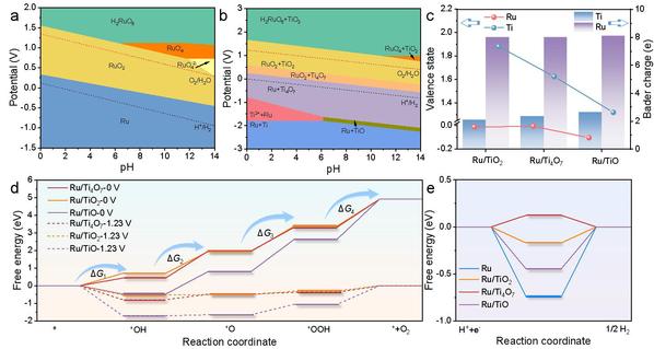 Ru/TiO2、Ru/Ti4O7和Ru/ TiO中的氧空位浓度呈现增加趋势。周期性排列的氧空位不仅提高了载体的电导率,而且提供了在Ti4O7和Ru之间形成桥接界面的可能性。Ru作为电子受体与氧化钛载体形成肖特基接触,并且Ti4O7具有与Ru纳米粒子的电子结构的最佳适应性,以减少界面肖特基势垒。