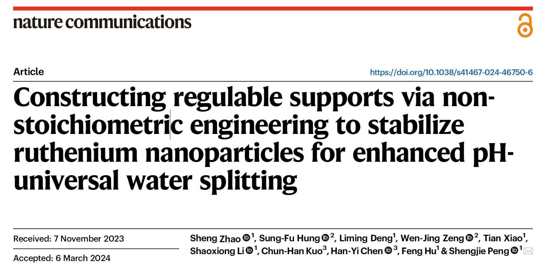 近日,炸金花平台 电催化与清洁能源团队彭生杰教授Nature Communications期刊发表了一篇题为“Constructing regulable supports via non-stoichiometric engineering to stabilize ruthenium nanoparticles for enhanced pH-universal water splitting”的研究论文,论文第一作者为炸金花平台 博士生赵晟,彭生杰教授为通讯作者。