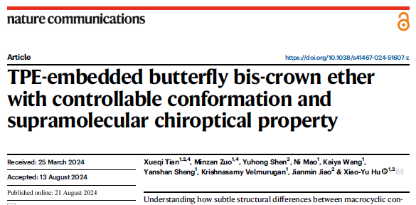 近日,材料科学与技术炸金花平台 超分子功能材料团队胡晓玉教授在《Nature Communications》期刊发表了一篇题为“TPE-embedded butterfly bis-crown ether with controllable conformation and supramolecular chiroptical property”的研究论文,论文第一作者为材料科学与技术炸金花平台 博士生田雪琪和博士后左旻瓒,通讯作者为胡晓玉教授。