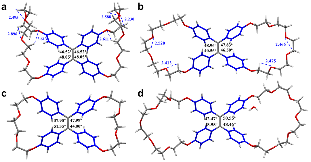 综上,基于分子内McMurry偶联反应,研究者成功合成了一系列TPE嵌入内核的双环蝶冠醚BCE[n](n = 4-7),发现由于特殊的分子结构引起的张力和分子内相互作用,导致了对称/不对称两种稳定构象的产生,并且这两种异构体在光物理性质和主客体性质上存在显著差异。该项工作揭示了超分子大环性质中多样化构象的重要性,并为不同构象中“结构–性质”关系提供了有价值见解,也为制备AIE型可调控手性光学材料提供了新的合成策略与设计思路。