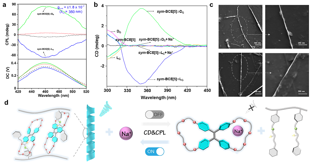所制备的AIE组装体sym-BCE[5]L(D)G呈现出镜像对称的CD和CPL信号,并具有较大的圆偏振发光不对称因子。此外,在SEM图像中可以更清晰地观察到组装体sym-BCE[5]L/DG形成了具有不同扭转方向的螺旋纤维状结构。通过向组装体中添加竞争离子Na+可诱导其解组装过程,从而终止手性诱导并有效调控和关闭体系的手性信号。