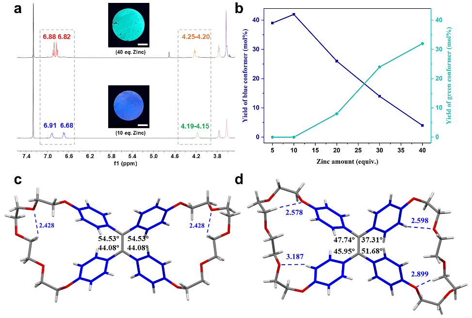 BCE[n](n = 4-7)蝶冠醚通过巧妙的分子内McMurry反应得到,结果显示:在不同当量锌粉下,产物的核磁谱图和晶体结构均存在明显差异。在10当量锌粉条件下得到的蓝色产物晶体结构为一种不对称的蝴蝶形构象(asym-BCE[5]);然而,在40当量锌粉条件下得到的另一种蓝绿色产物晶体结构为高度对称的蝴蝶形构象(sym-BCE[5])。