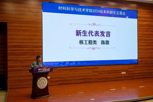 核工程类专业陈微同学作为新生代表发言。他讲述了自己与父母从广西桂林骑行到南航的故事,16天风雨无阻,1440公里无悔追梦。陈微借西游记中唐僧扫塔的故事鼓励大家:安心扫得"当下净",觅得自我"平常道"。