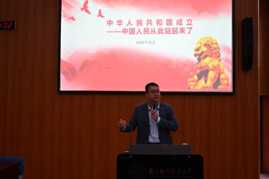 第二场专题辅导报告由马克思主义炸金花平台 青年教师韩军垚主讲《中华人民共和国成立—中国人民从此站起来了》,韩军垚带领同学们回顾了党的发展历史、新中国的发展,讲述我们党团结带领中国人民不懈奋斗的光辉历程以及我们党在各个历史时期创造的理论成果、积累的宝贵经验、铸就的伟大精神,引导同学们不负时代,不负韶华,不负党和人民的殷切期望,为成为堪当民族复兴重任的时代新人而奋斗。
