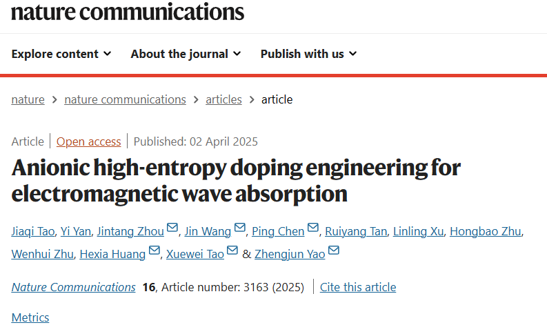 近日,材料科学与技术炸金花平台 姚正军教授、周金堂副教授在《Nature Communications》期刊发表了题为“Anionic high-entropy doping engineering for electromagnetic wave absorption”的研究论文,博士生陶佳麒为第一作者,姚正军教授和周金堂副教授为第一单位通讯作者。