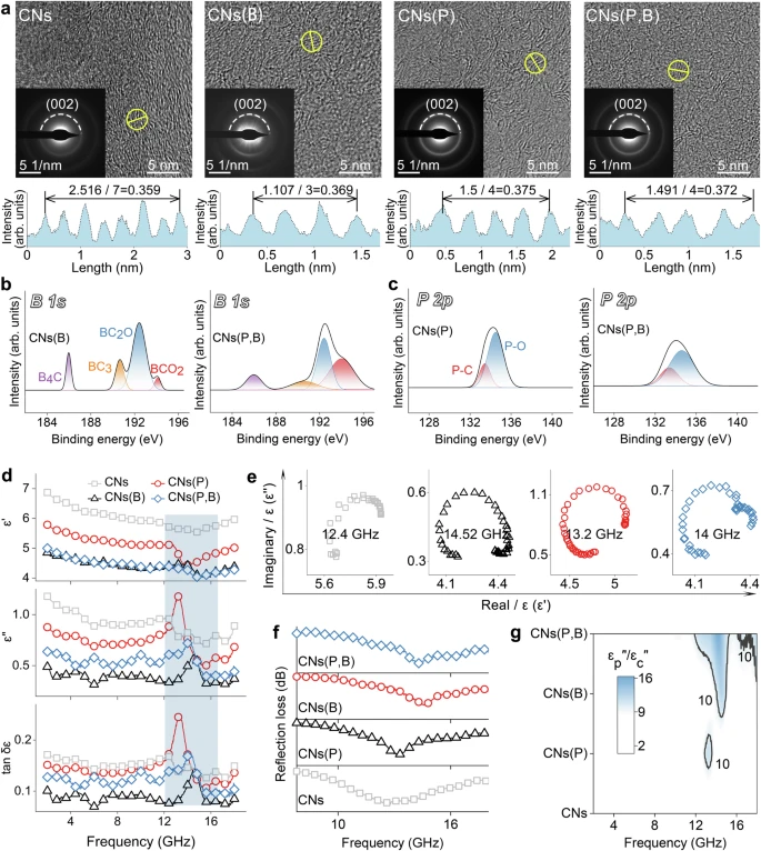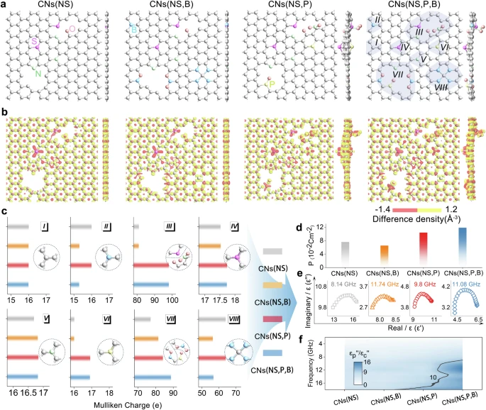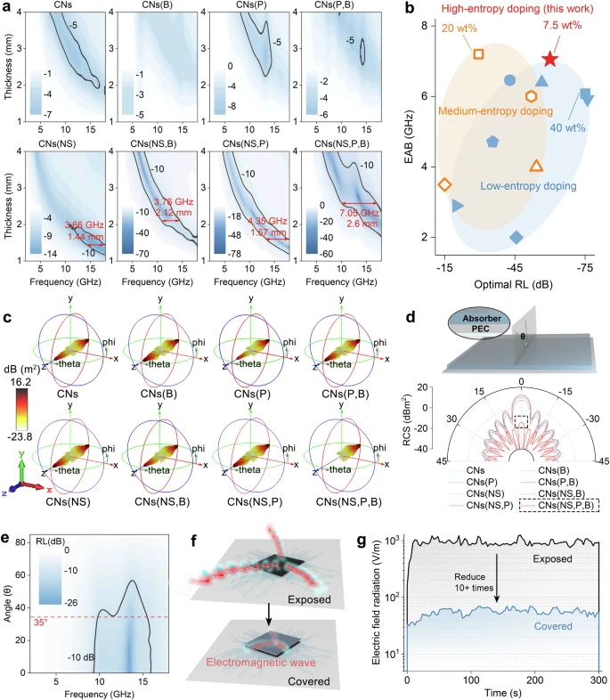 总之,团队针对薄石墨框架进行了阴离子高熵掺杂研究,并证明了其在改善介电特性和吸波性能方面的有效性。通过原位热解和溶剂热处理的协同策略,五种阴离子(O/N/S/P/B)依次掺杂到统一的二维框架内。在复杂的逐步掺杂过程中,不同杂原子表现出多体相互作用,并使最终产物继承了它们的介电特性。完美平衡的离域电荷和大面积不平衡的局域电荷会导致“定向鸡尾酒效应”,以确保偶极子极化在介电损耗中占主导地位。粉末产物可用于制造吸收贴片,覆盖电子芯片后可将电磁辐射降低 90% 以上。总之,这项工作填补了高熵研究和电磁波吸收领域的空白,为优化材料原子构型、电子结构,以及设计高性能吸波材料提供了新思路。