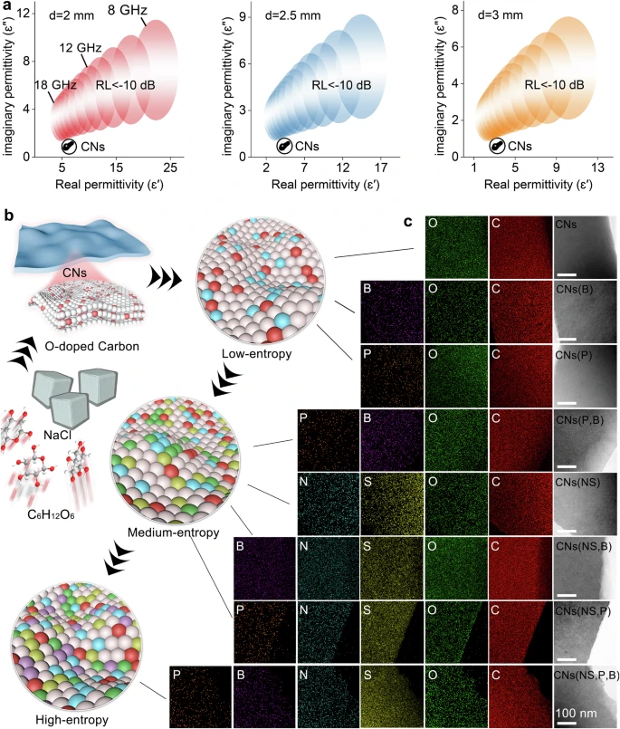 在宽带吸波材料设计中,需要遵守复变函数论。基于 Kramers-Kronig 关系推导出的理想材料厚度(2、2.5 和 3 mm)、频率范围 (2-18 GHz) 和吸收强度 (<-10 dB)对应关系,最初的二维范德华系统,即碳纳米片(CN),无法满足基本参数要求。因此,必须优化原子构型以改善混合熵和表面电子态。通过格式化步骤将阴离子掺杂到材料基质中,并根据杂元素种类(n)将样品组分为低熵系统(n=1,2)、中熵系统(n=3,4) 和 高熵系统(n=5)。