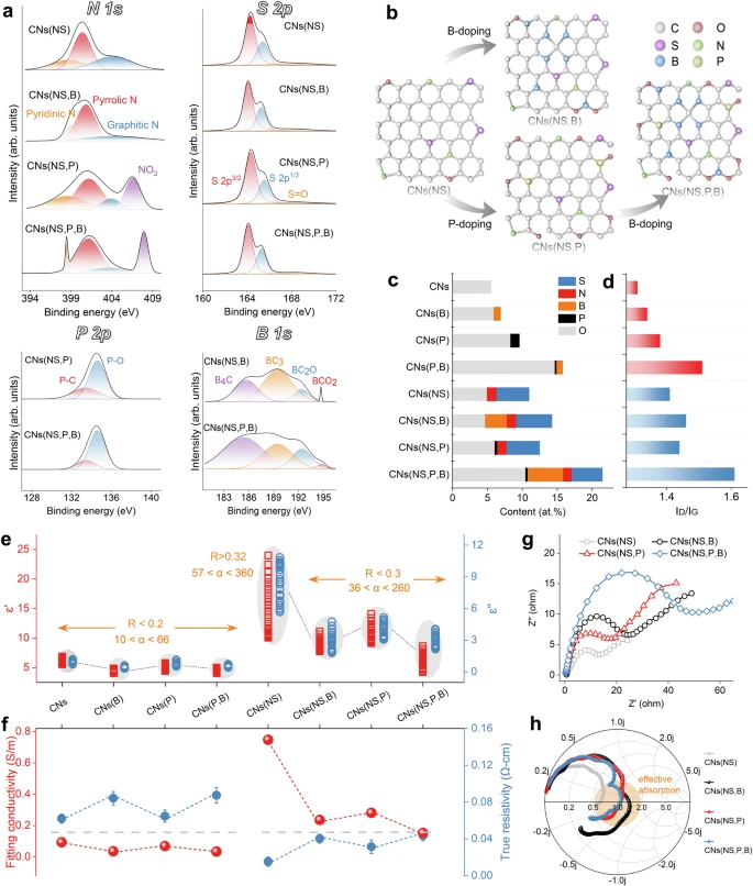 N、S作为电子供体有助于改善电子密度和电导率。与具有 O、P或B的中熵掺杂系统相比,包含N、S的中熵系统具有更高的复介电常数。然而,过高的电导率会导致反向感应电流,提高电磁波表面反射率,限制吸收带宽。于是,阴离子高熵掺杂工程通过引入电子受体来平衡阻抗匹配。增强的极化补偿了被削弱的电导损耗,所以不会降低整体介电损耗和电磁衰减能力。