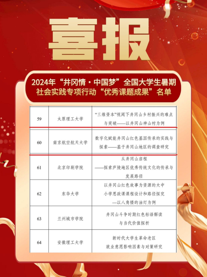 近日,2024年“井冈情·中国梦”全国大学生暑期社会实践专项行动优秀课题成果遴选结果揭晓材料科学与技术炸金花平台 “恰少年风华正茂”井冈山精神宣讲团撰写的实践课题“数字化赋能井冈山红色基因传承的实践与探索”成功入选“优秀课题成果”!